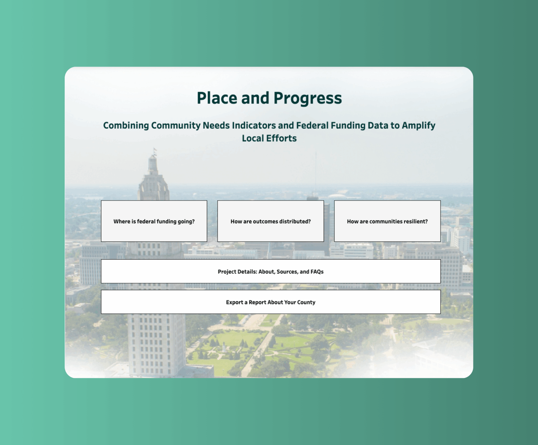 Unlike most tools that use census tracts, Place and Progress aggregates data at the county level. That decision let us bring in additional layers like funding and resilience to tell a more complete story about both the challenges and strengths within a place.